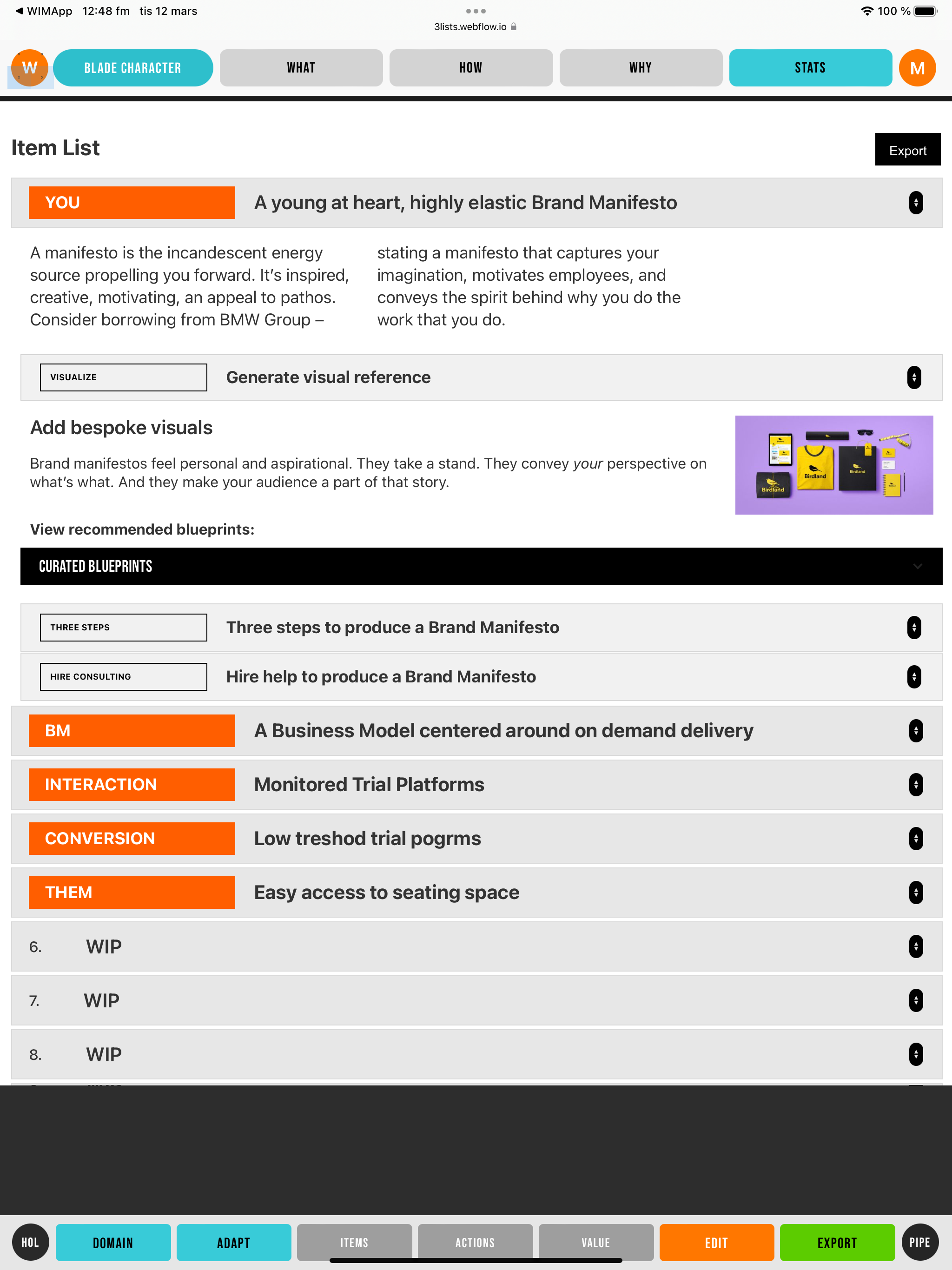 Export a WIMfile—a structured blueprint containing action lists, item lists, and metrics.